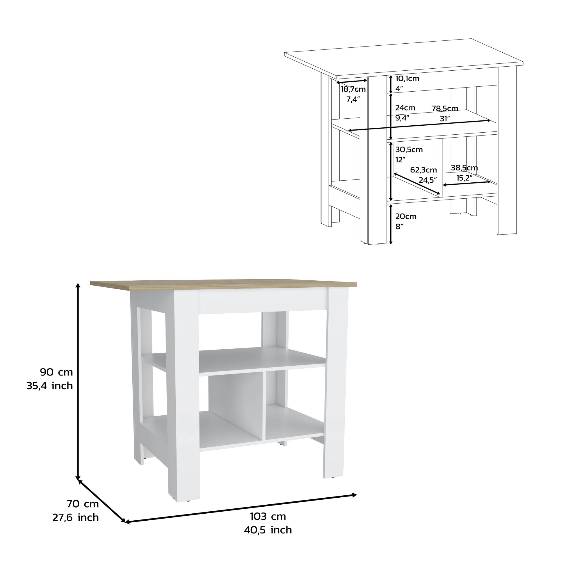 This island has a big and robust top surface that makes it suitable for use as a primary table or workspace (40,5"W X 27,6"D).