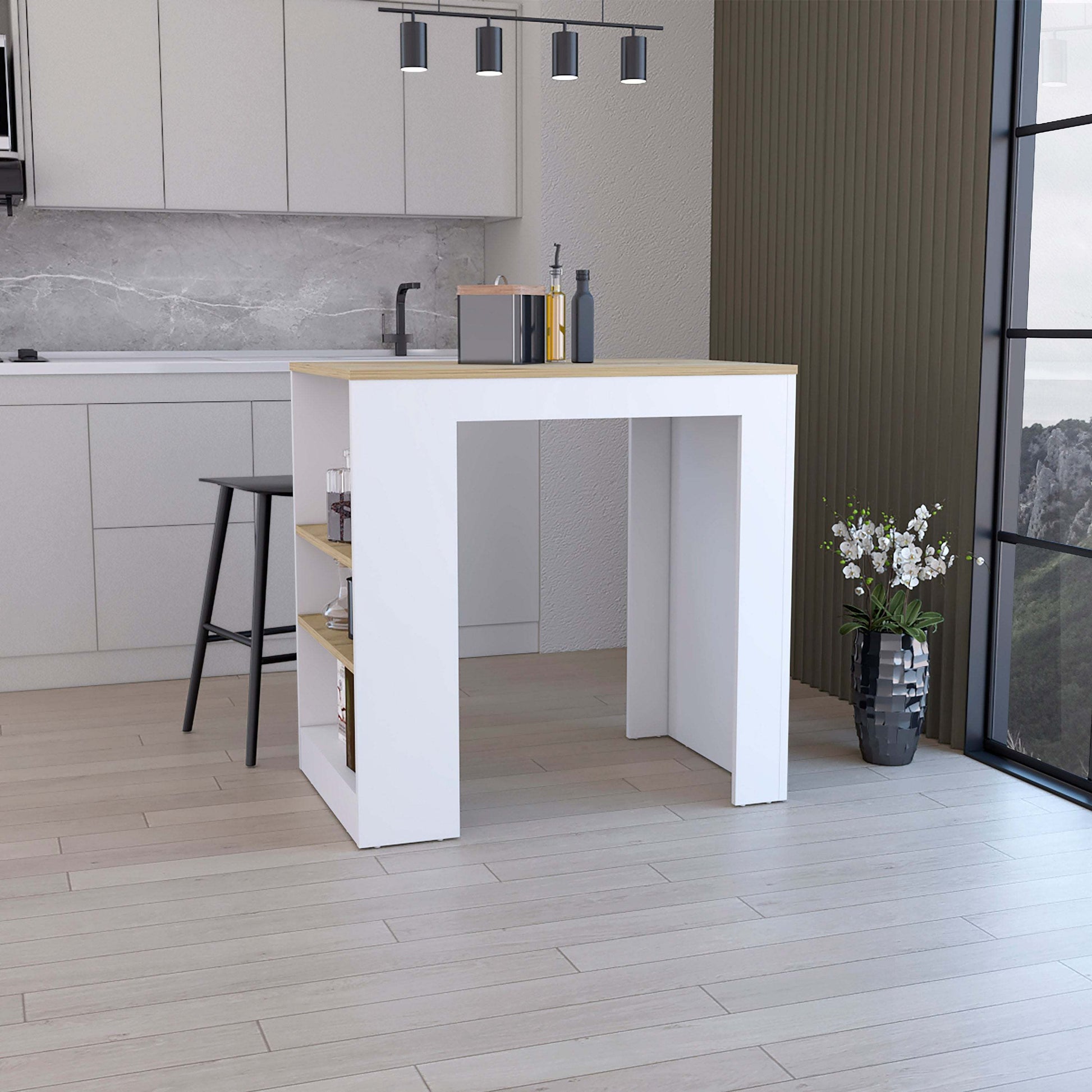DEPOT E-SHOP Lacour Kitchen Island, Kitchen Bar Table with 3-Side Shelves, White / Macadamia