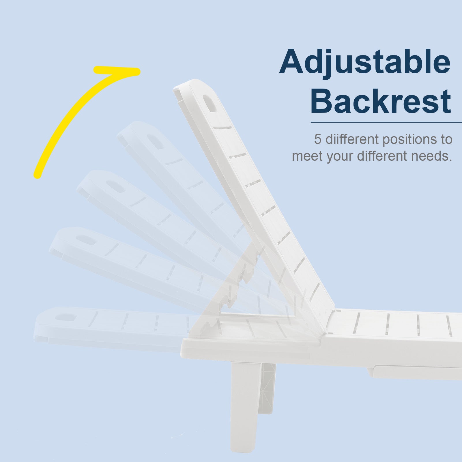 "[Upgraded Components]: A Retractable Side Tray from the right side of the chaise lounge chair slides out to hold food or drinks.That's convenient to keep hydrated and refreshing while tanning or relax within easy reach. The Backrest of the ergonomically designe provides maximum comfort with 5 adjustable in preset angles.From sitting to lying flat,you can always find the most comfortable position as you need.Leaning against the recliner, be careful,or tanning may just be taking a nap."