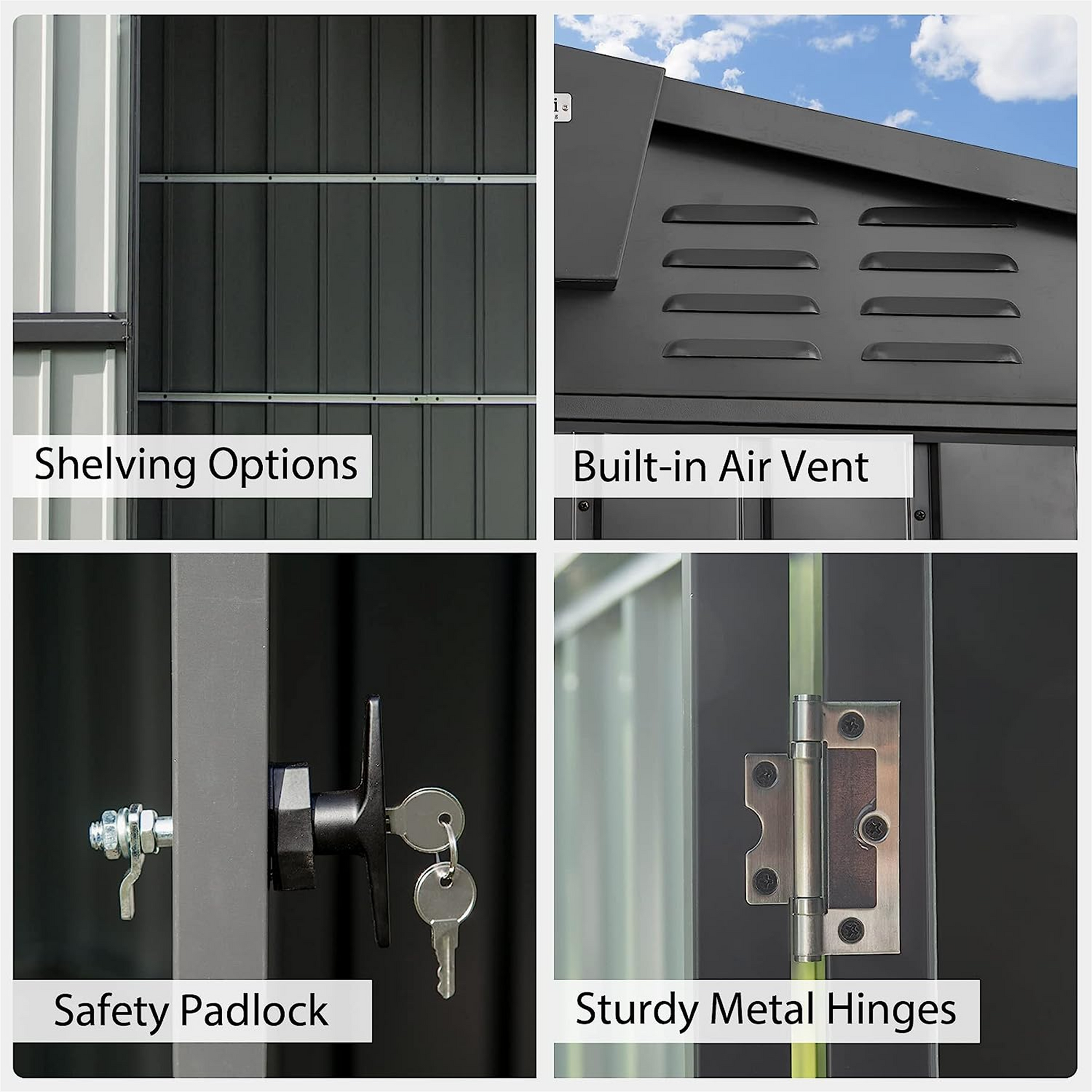 High-quality Material: The tool shed is made of high-quality galvanized metal, which is anti rust and corrosion. Leak resistant top with tight construction, and thick walls with dent resistant durability enable it to last for many years without maintaining.