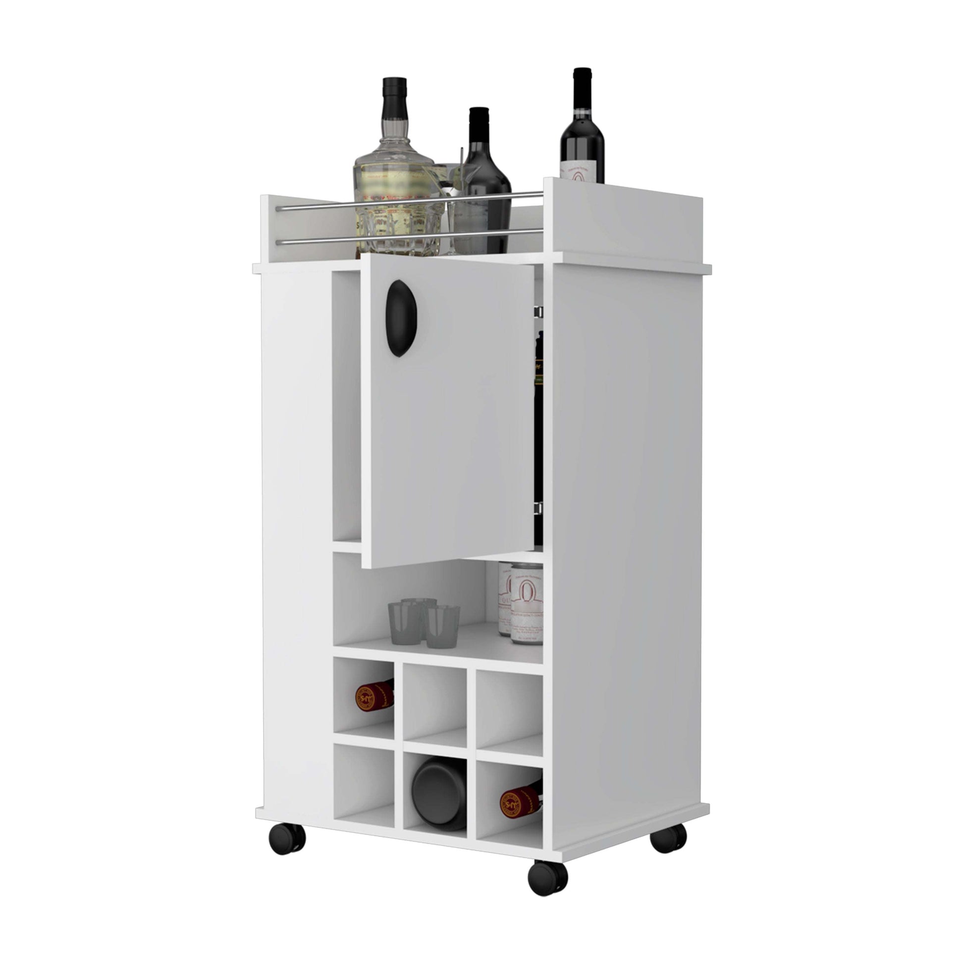 Elevate your gatherings with the exquisite Allandale Bar Cart, designed to impress and inspire. Featuring a spacious upper surface, the Allandale Bar Cart offers ample room for mixing cocktails, pouring drinks, or displaying spirits. Impress your guests with the two side shelves, perfect for showcasing your favorite bottles, glassware, or decorative items. Stay organized with the single-door cabinet, providing additional interior storage for your bar essentials. The 6-built-in wine racks and open compartment ensure your finest collection is always within reach, while the smooth-rolling casters allow for effortless relocation to your preferred spot.