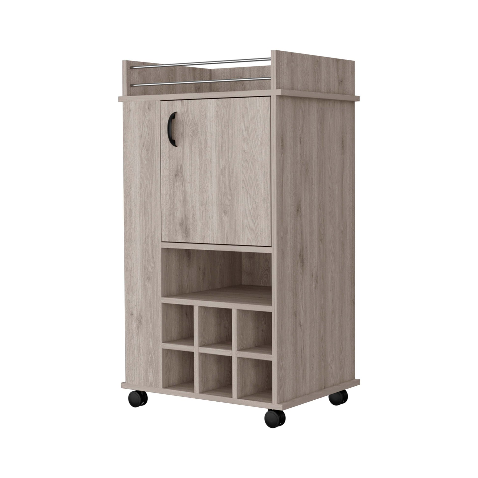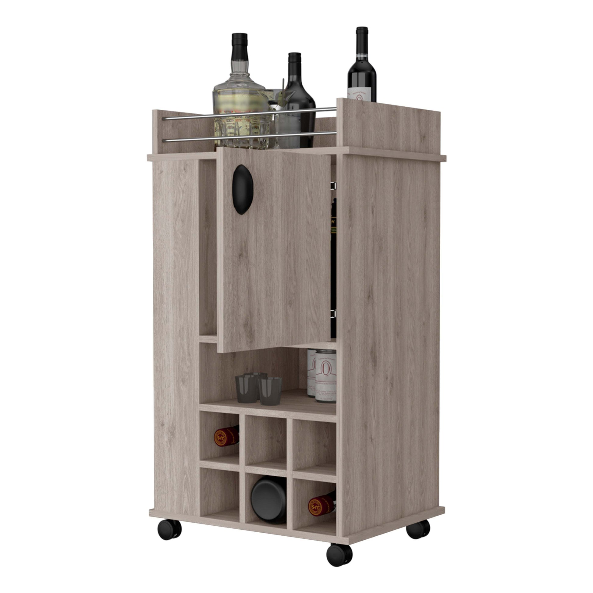 Elevate your gatherings with the exquisite Allandale Bar Cart, designed to impress and inspire. Featuring a spacious upper surface, the Allandale Bar Cart offers ample room for mixing cocktails, pouring drinks, or displaying spirits. Impress your guests with the two side shelves, perfect for showcasing your favorite bottles, glassware, or decorative items. Stay organized with the single-door cabinet, providing additional interior storage for your bar essentials. The 6-built-in wine racks and open compartment ensure your finest collection is always within reach, while the smooth-rolling casters allow for effortless relocation to your preferred spot.