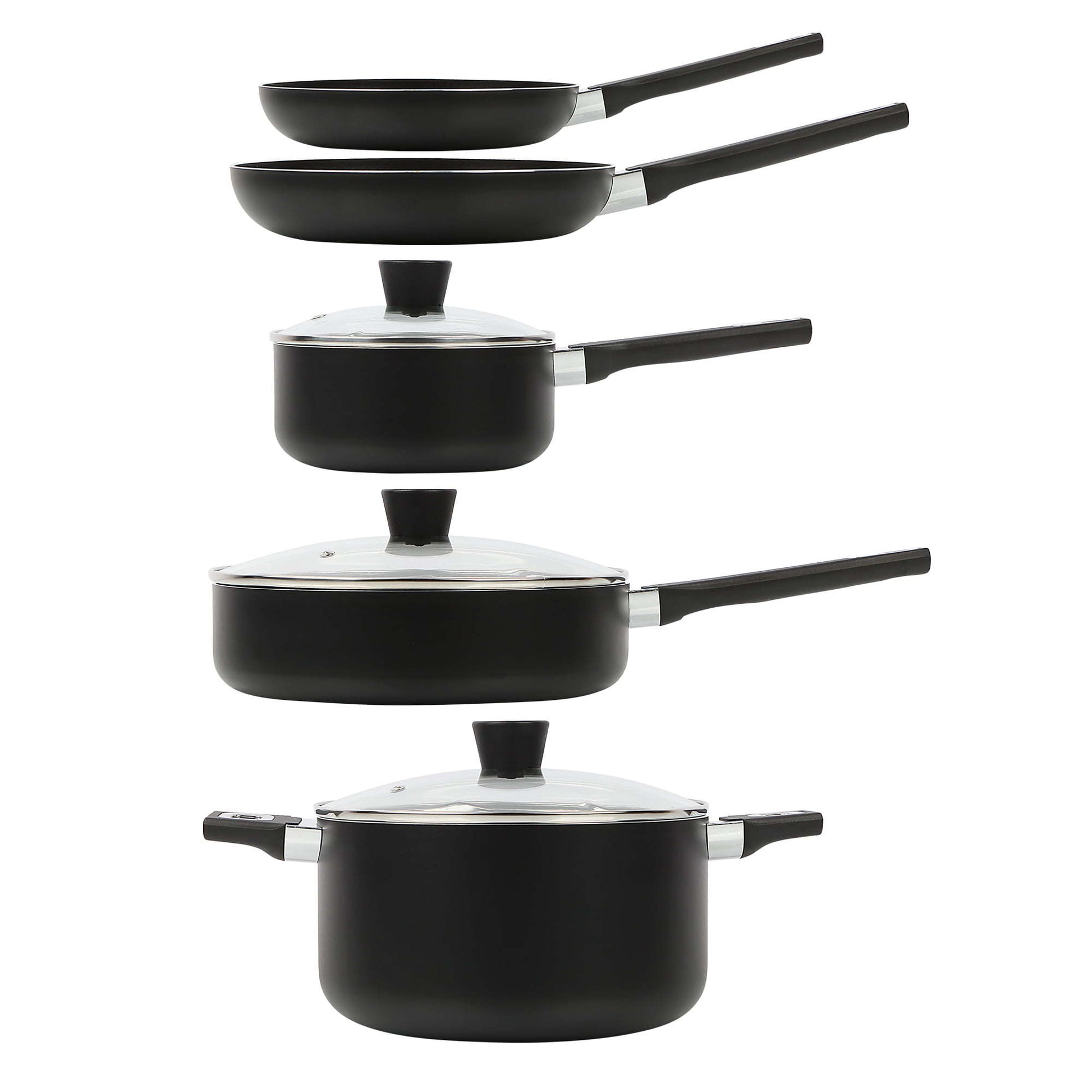 aluminum nonstick midweight 13 pcs set in black color. Ideal for everyday multi-use at home, it is total 13 pcs, includes 18cm/2qt covered saucepan; 24cm/6qt covered dutch oven; 20cm/8in skillet; 24cm/9.5in skillet; 26cm/4qt covered jumbo cooker; 5pcs nylon tools(1pc slotted spatula; 1pc spatula; 1pc slotted spoon; 1pc spoon, 1pc pasta server). The cookware set heats quickly and evenly with its aluminum body.Its interior is coated with 2 layers non-stick black coating which makes it easy cook and easy clean-up. Exterior coating is black high heat resistant coating. The coating is made without PFOA. The 5pcs nylon tools also help the cooking every day. The cool touch handles make it easy and comfortable handling. Handle is strongly connected by rivets. It is suitable for all cooktops except induction. And it's dishwasher safe, but hand washing will prolong the life of the nonstick coating.