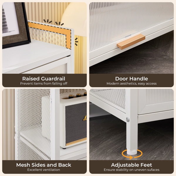 1.Visual Flipped Cabinet Door: The storage cabinet adopts a detachable wave pattern flipped PC door panel, a semi transparent door panel, with a stylish appearance. It can put various things in the cabinet, keep away from dust, or flip the door to take away what you want.