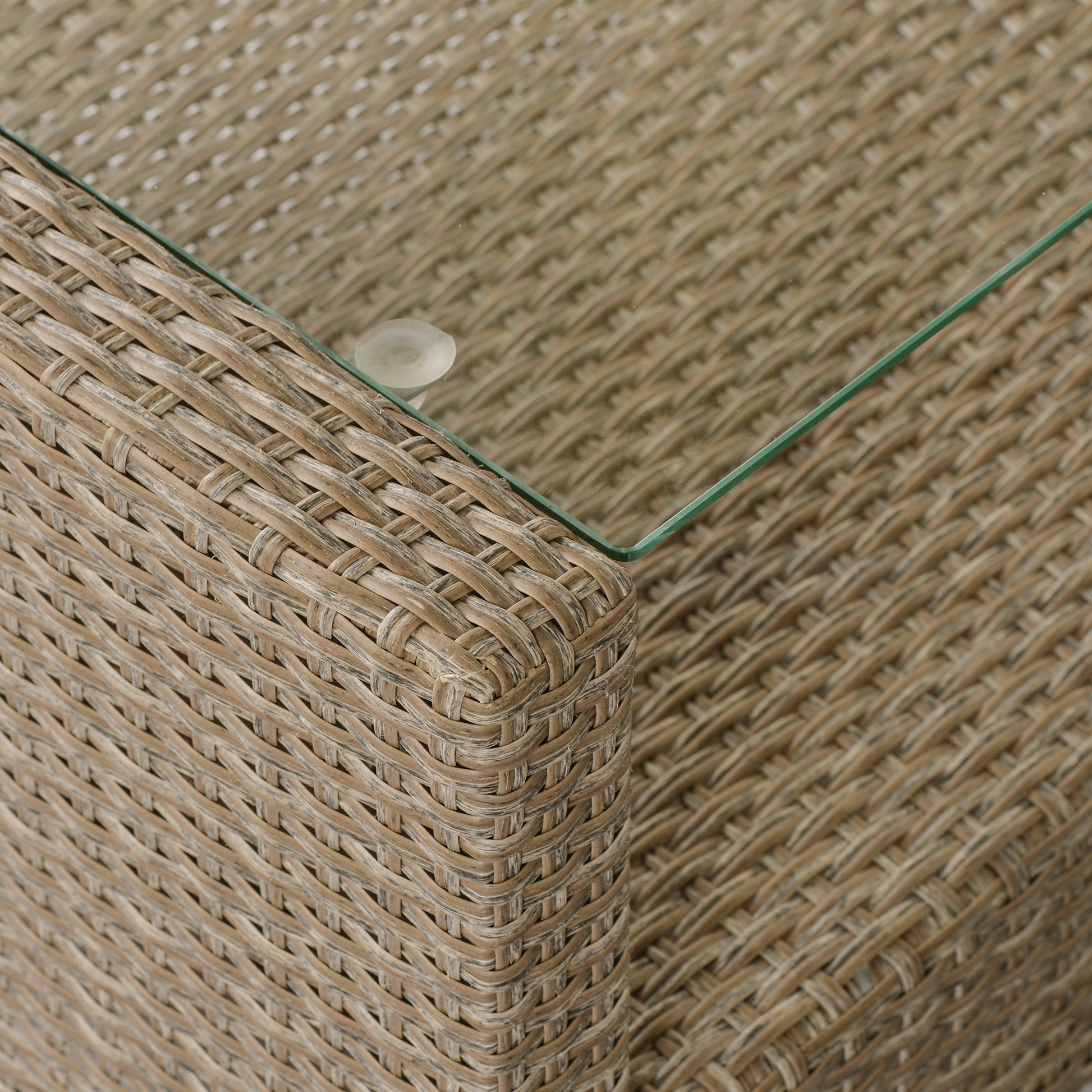 Give your backyard a classy polished seating space with our 4-Piece Conversation Patio Set. Charming in design, this set features a 2-seater sofa, lounge sofa, coffee table and side sofa chair. Instantly create a cohesive sectional by simply pushing the 2 seater sofa and lounge sofa together, or separate them if you want your patio set to cover a larger area of space. Crafted with a classic beige thick woven rattan wicker weaving reinforced with rust-resistant steel, this patio set is resistant to water, cracking, splitting and sun rays so it can last years to come. The center coffee table features a modern floating glass surface perfect for placing food and drinks to make spending time outdoors even more enjoyable. Lean back and relax for hours on end with the thick high density foam cushions upholstered in soft fabric covers that are formulated for easy spot cleaning, and enjoy the four back cushions that feature charming button tufting for an elegant appearance.