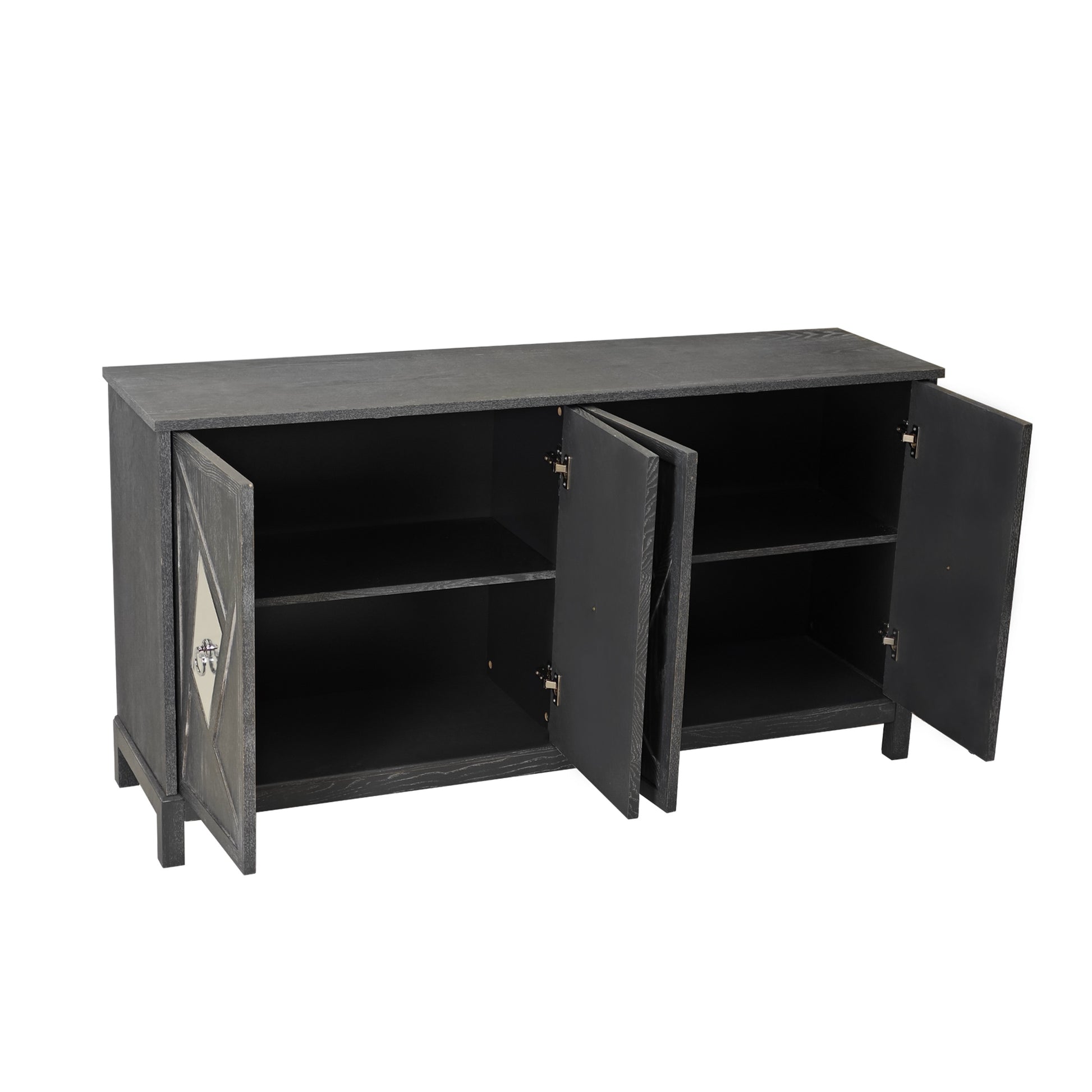 1.Elegant and Functional Design: This modern 4-door cabinet is a perfect blend of style and functionality. Its decorative doors with geometric patterns and small square mirrors in the center add a touch of sophistication to any room, making it a stunning focal point.The center of each door is adorned with a small square mirror, reflecting light and creating a sense of spaciousness.