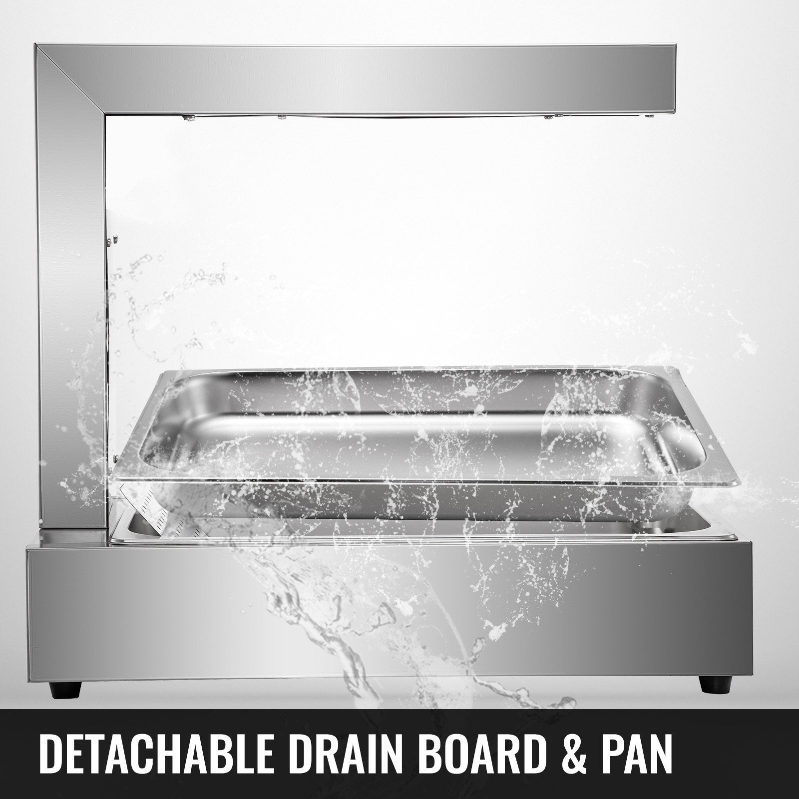 The hot lamp for food comes with a flat perforated drainboard and a 2.6" (65 mm) deep food pan for draining excess oil from fried food, which are detachable for easy and quick cleanup.