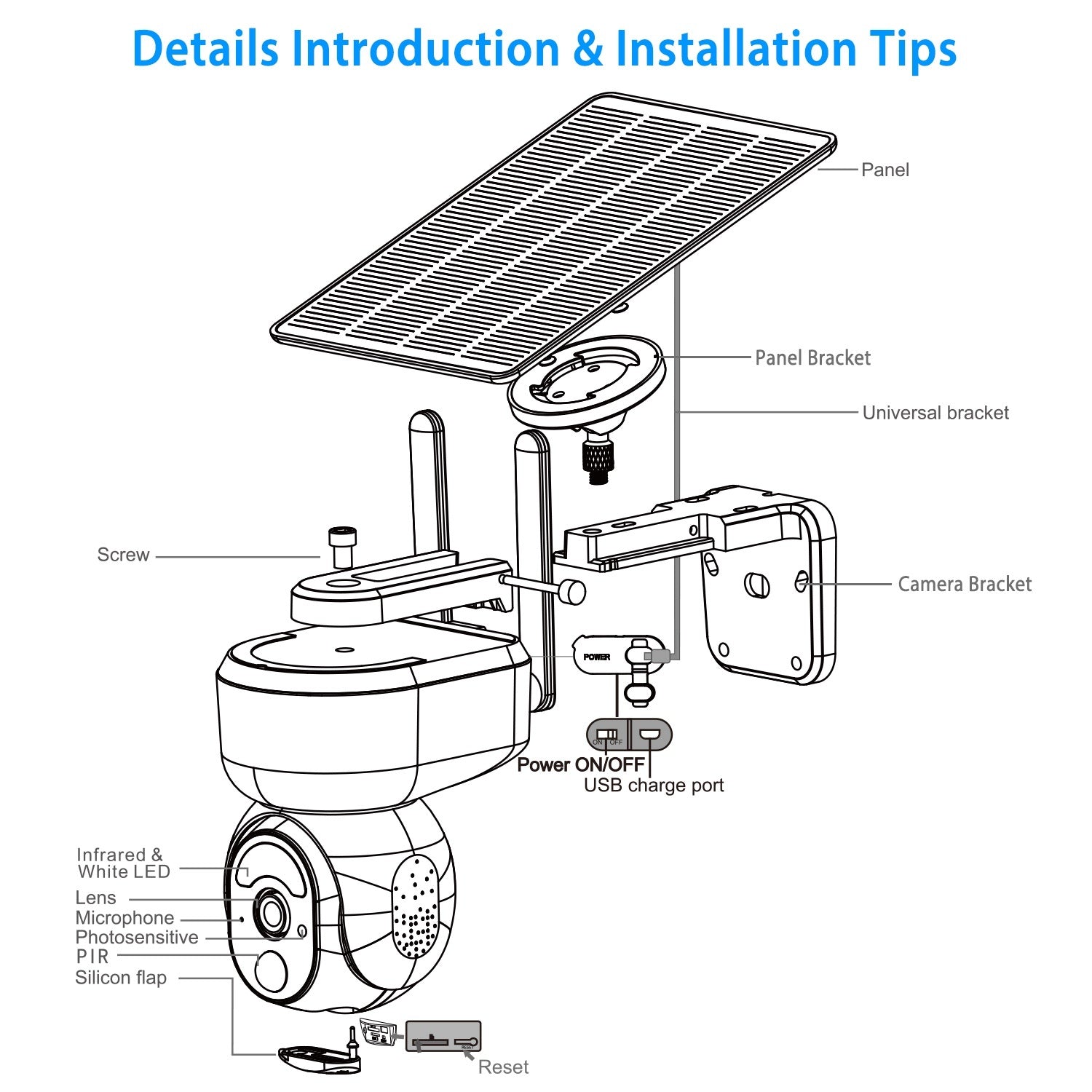 *USB & Solar Powered*:Powered by 9000mAh lithium battery and equipped with solar panel and Wi-Fi antenna,ensure eternal power. No hassle of removing the camera to charge. It also can be recharged via USB cable about 8 hours for fully charged. It can be placed on the desk for indoor use or installed on the wall with solar panel for indoor/outdoor use. IP66 waterproof allows the camera to withstand heavy weather like rainy and snowy day. No need to worry when installed outside.