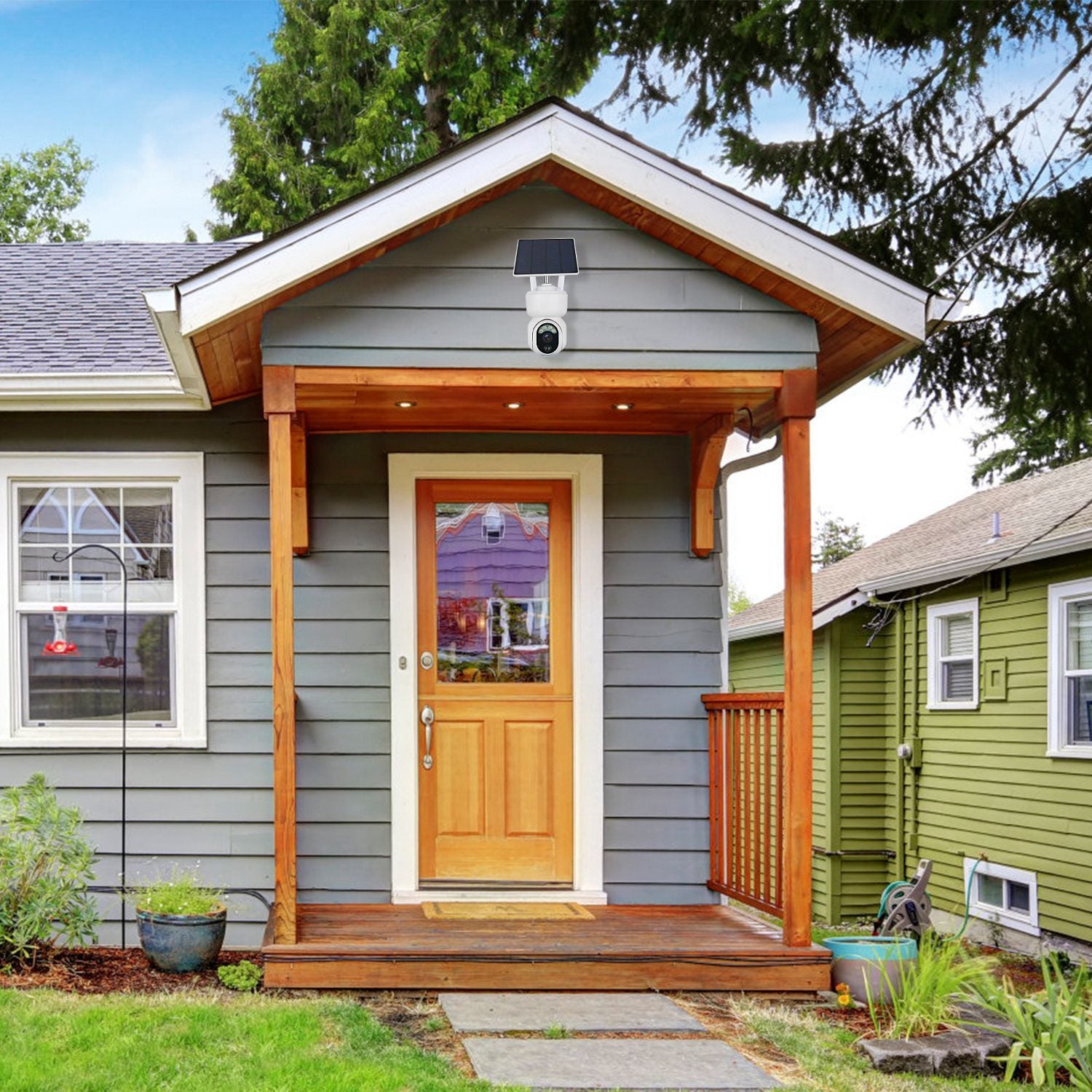 *Night Vision & Flood Light*:IR night vision function allows the camera to capture the scene in the dark and keeps you informed of any happenings even at night within 65.6ft distance. Built-in flood lights will automatically turn on when the camera detects someone passing by during the night,then the picture will turn to be colorful and allows you to see clearer image in your phone.
