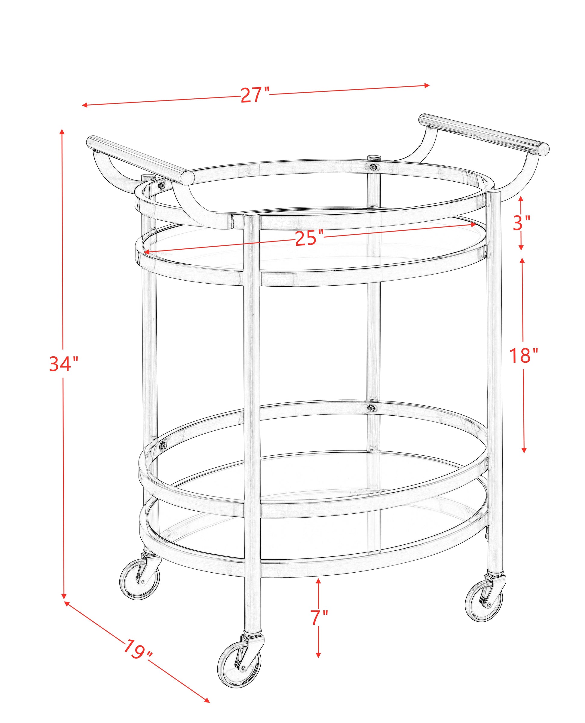 •KD, Oval Serving Cart• Open Storage: 2 Shelves (Top Glass, Base Mirrored)• Top Shelf: 5mm Clear Tempered Glass• Bottom Shelf: 5mm Mirror & 3mm Hardboard• Metal Frame & Handles: Rose Gold Finish, 1.0mm x 1" round tube, 1.0mm x 13 x 26mm tube• Caster Wheels